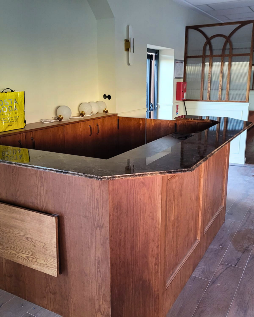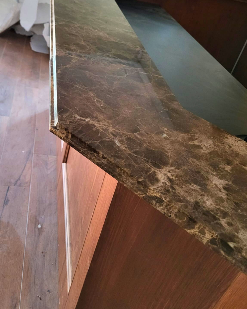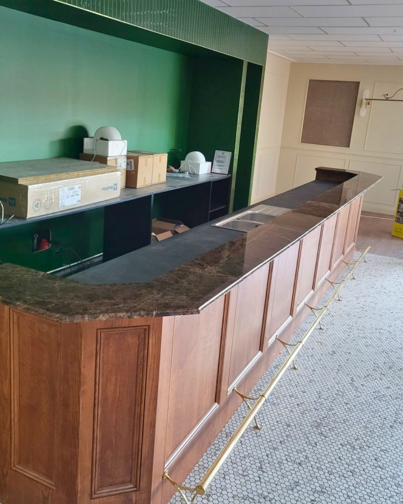 Uno de nuestros trabajos más recientes ha sido la ejecución de un proyecto para un restaurante, donde se instaló mármol Marrón Emperador con un grosor de 2 cm, cuidadosamente seleccionado y trabajado a medida.